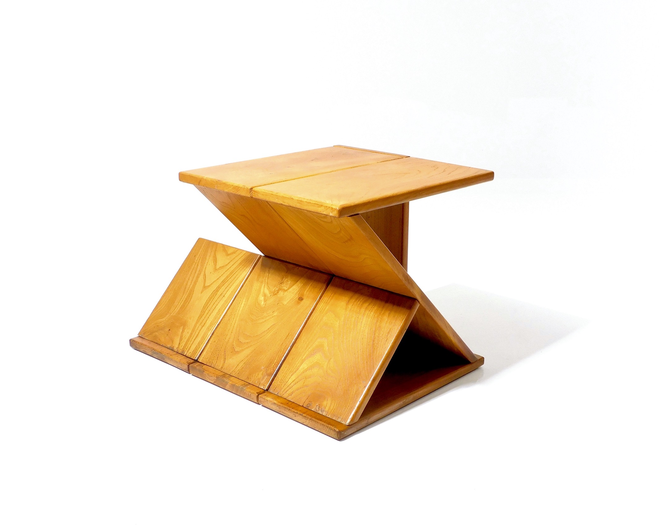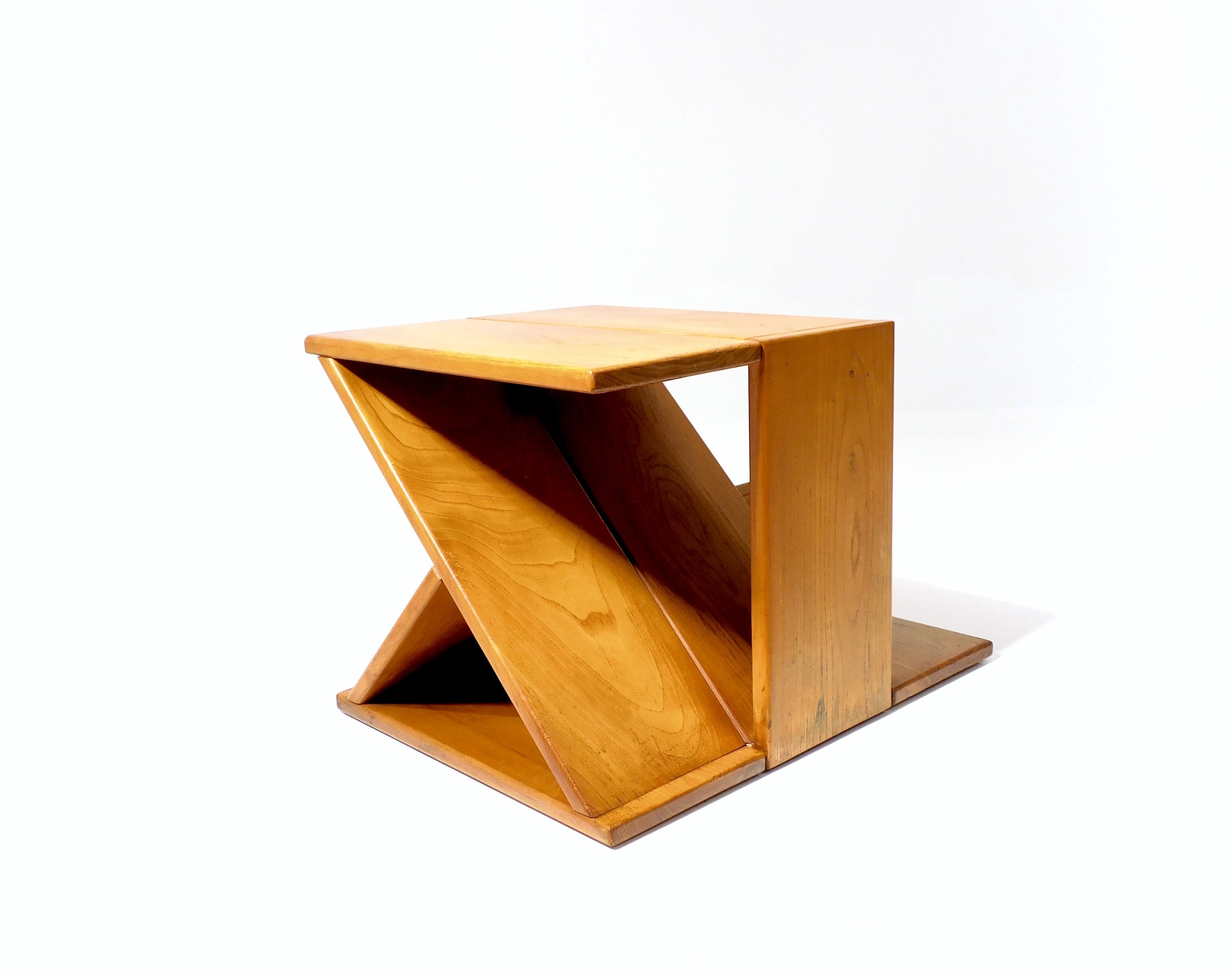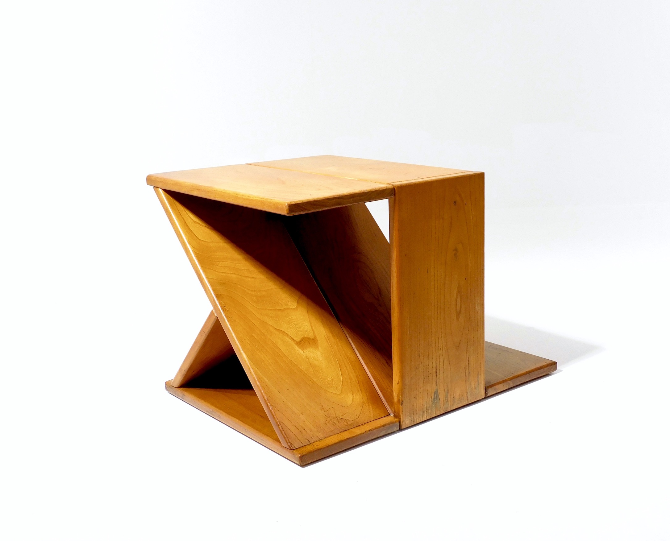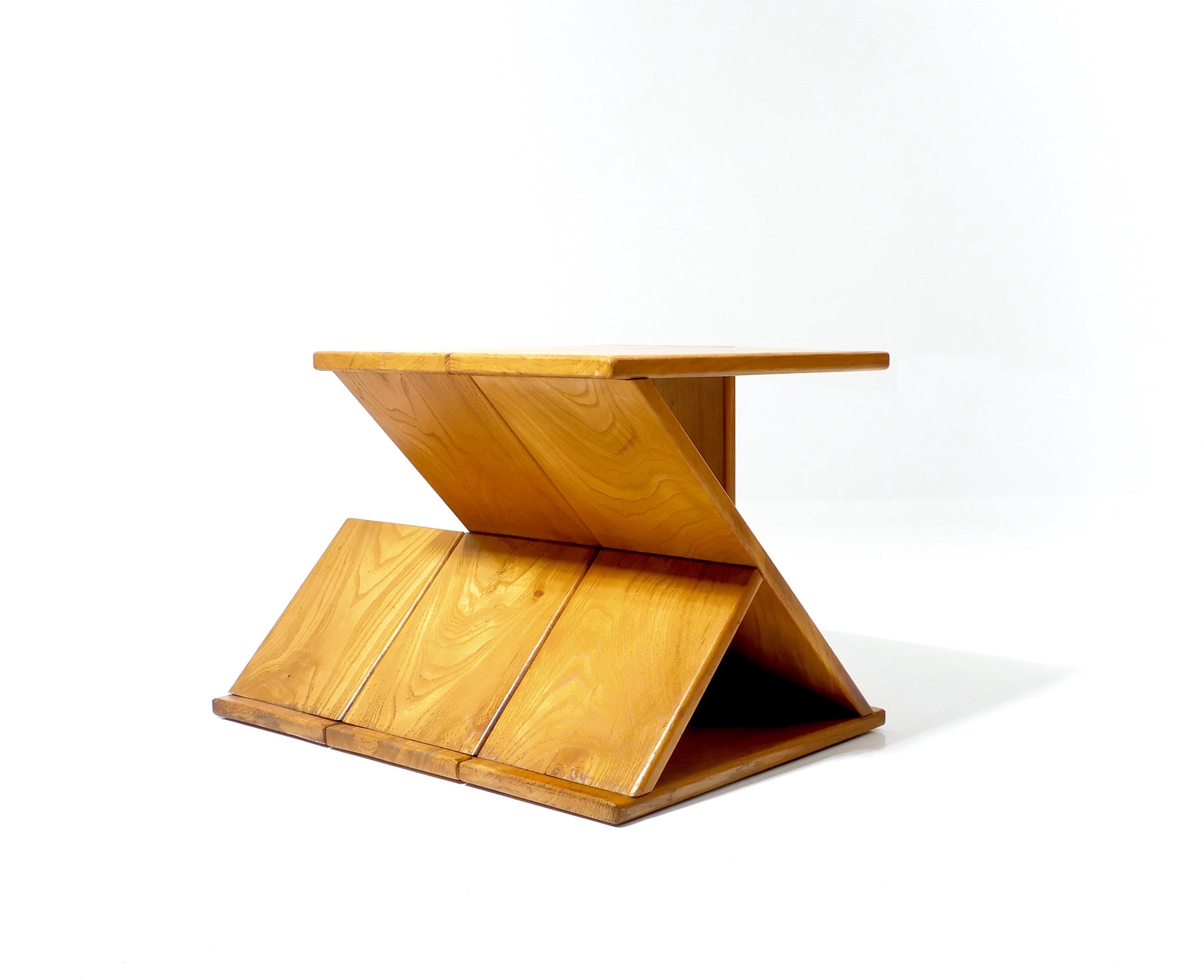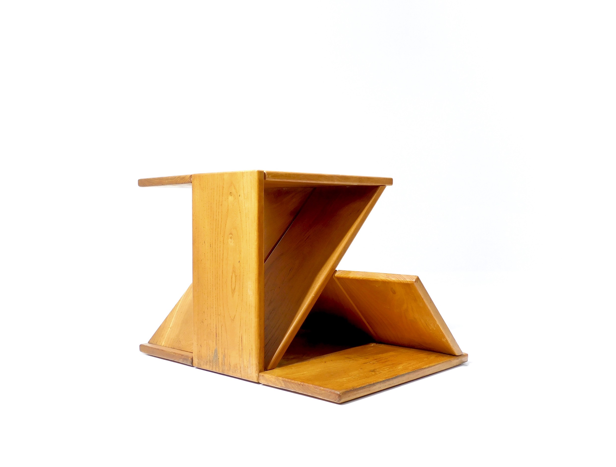 Der Französische Designer Alain Ladroit entwarf in den 1970/ 80er Jahren dieses fantastische, skulpturale Objekt, welches gleichzeitig Beistelltisch, Hocker und Zeitschriftensammler ist. Hergestellt wurde es durch das Französische Möbelunternehmen Maison Regain. Massives Ulmenholz, lackiert. Guter, stabiler Zustand mit charmanten Gebrauchspuren. Höhe 35cm.