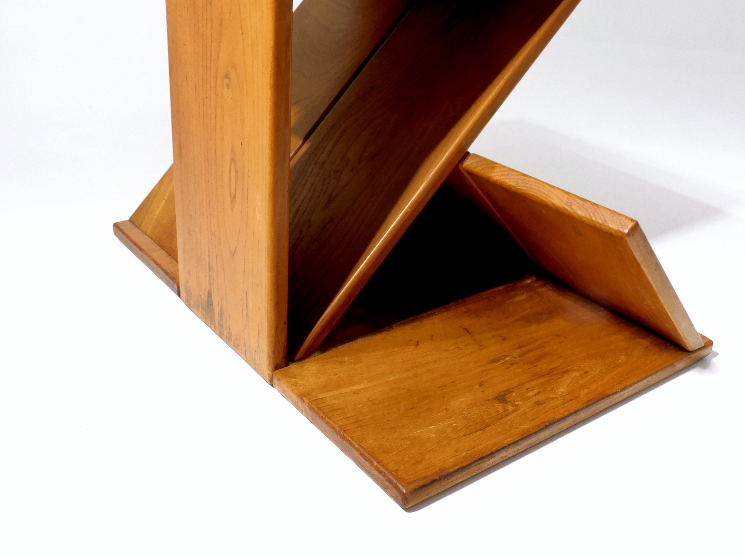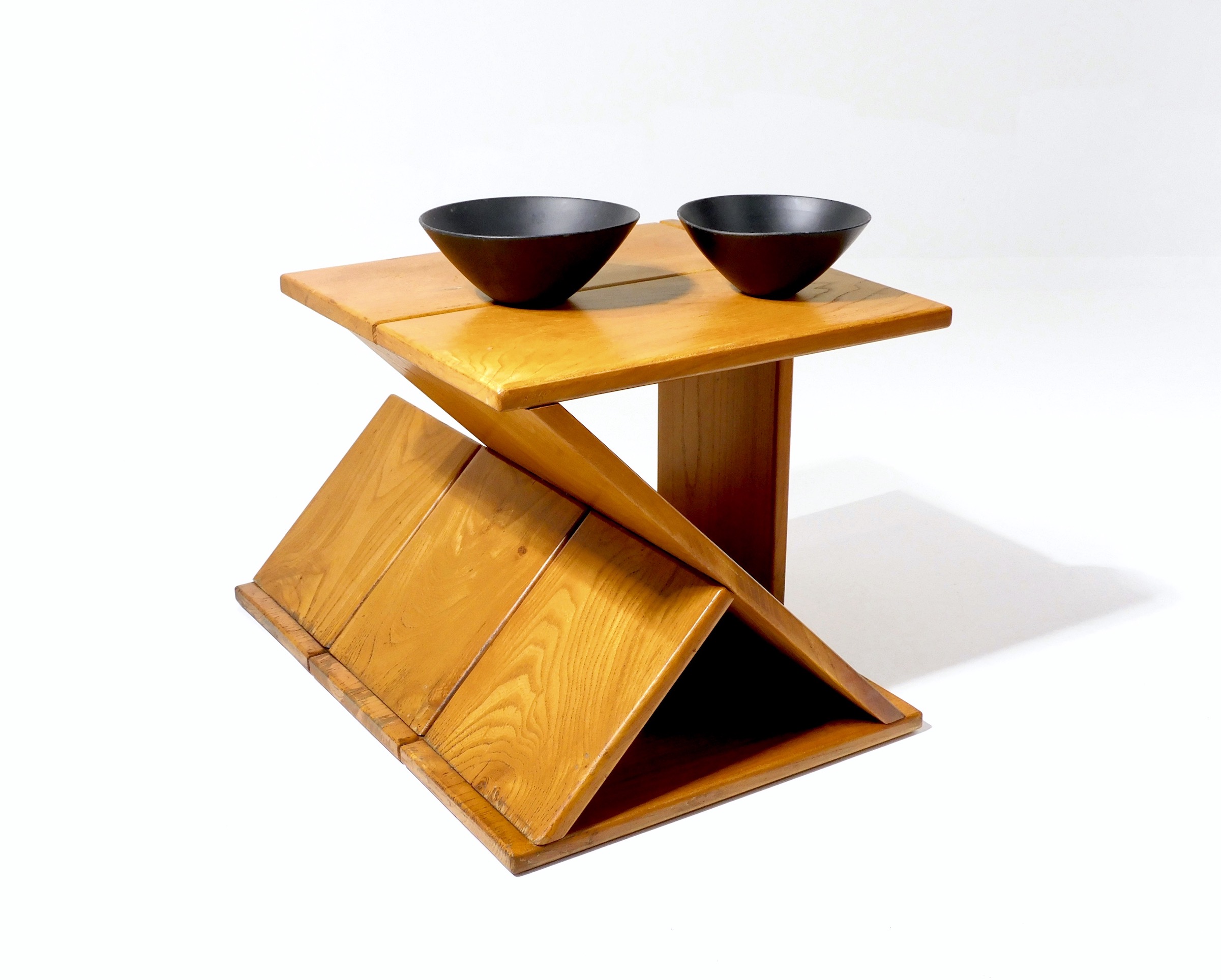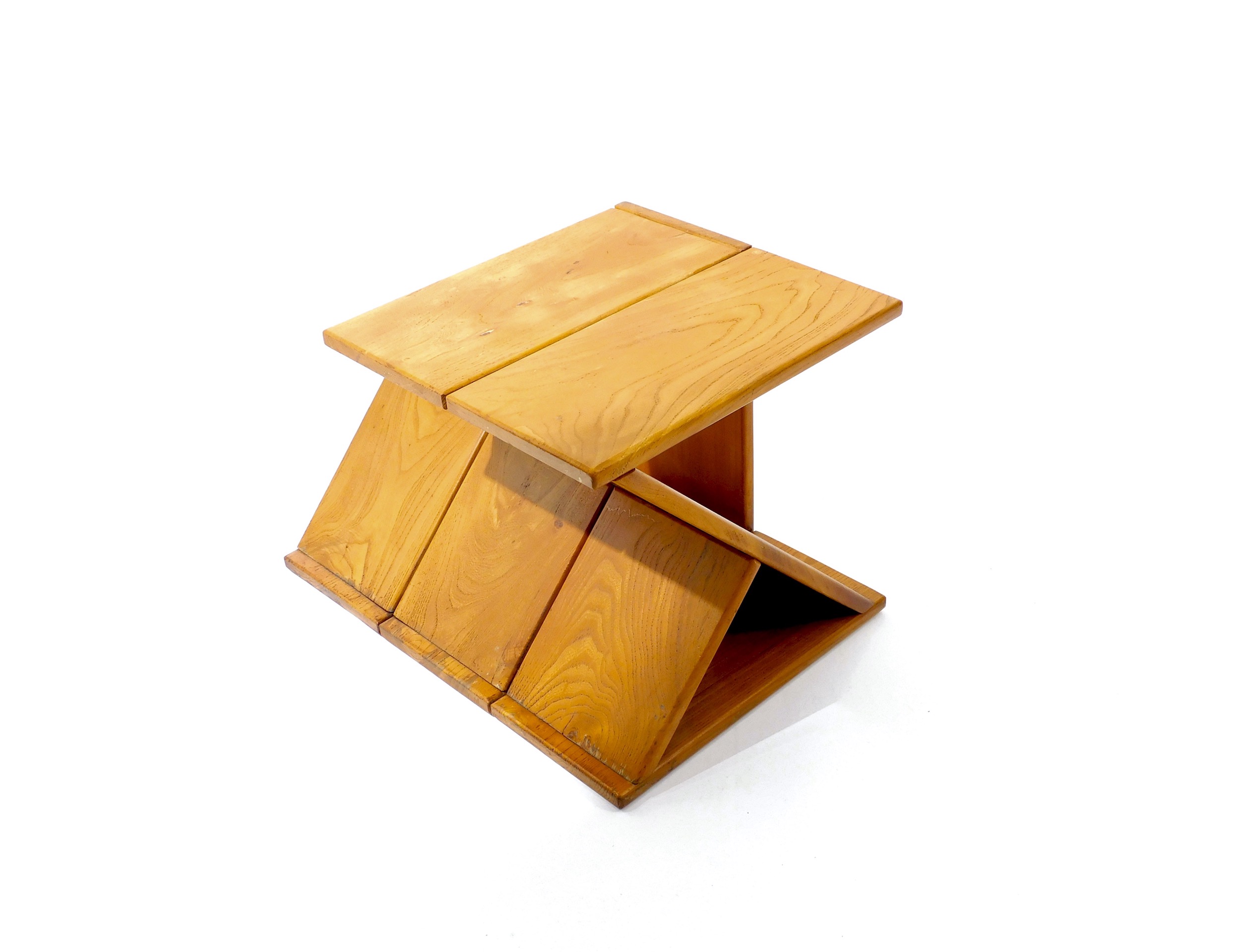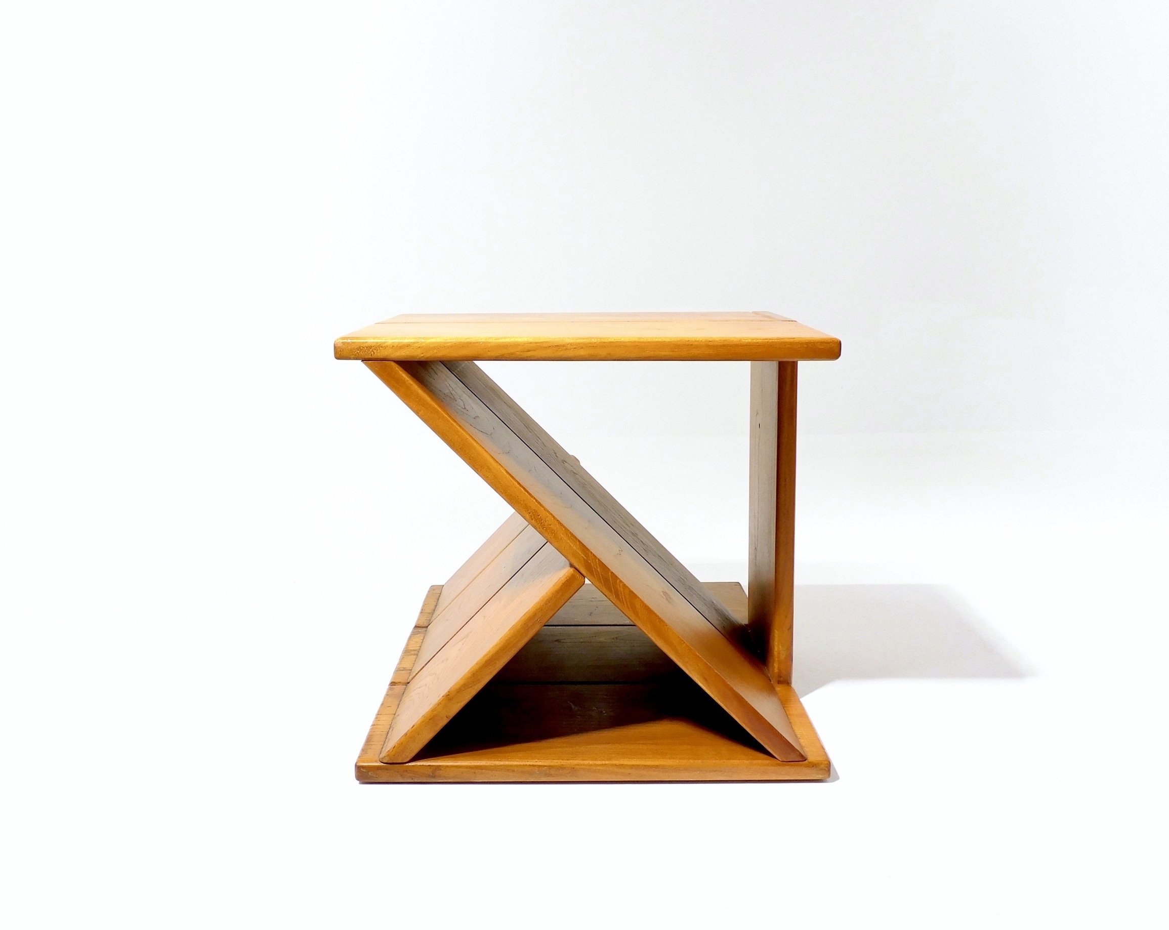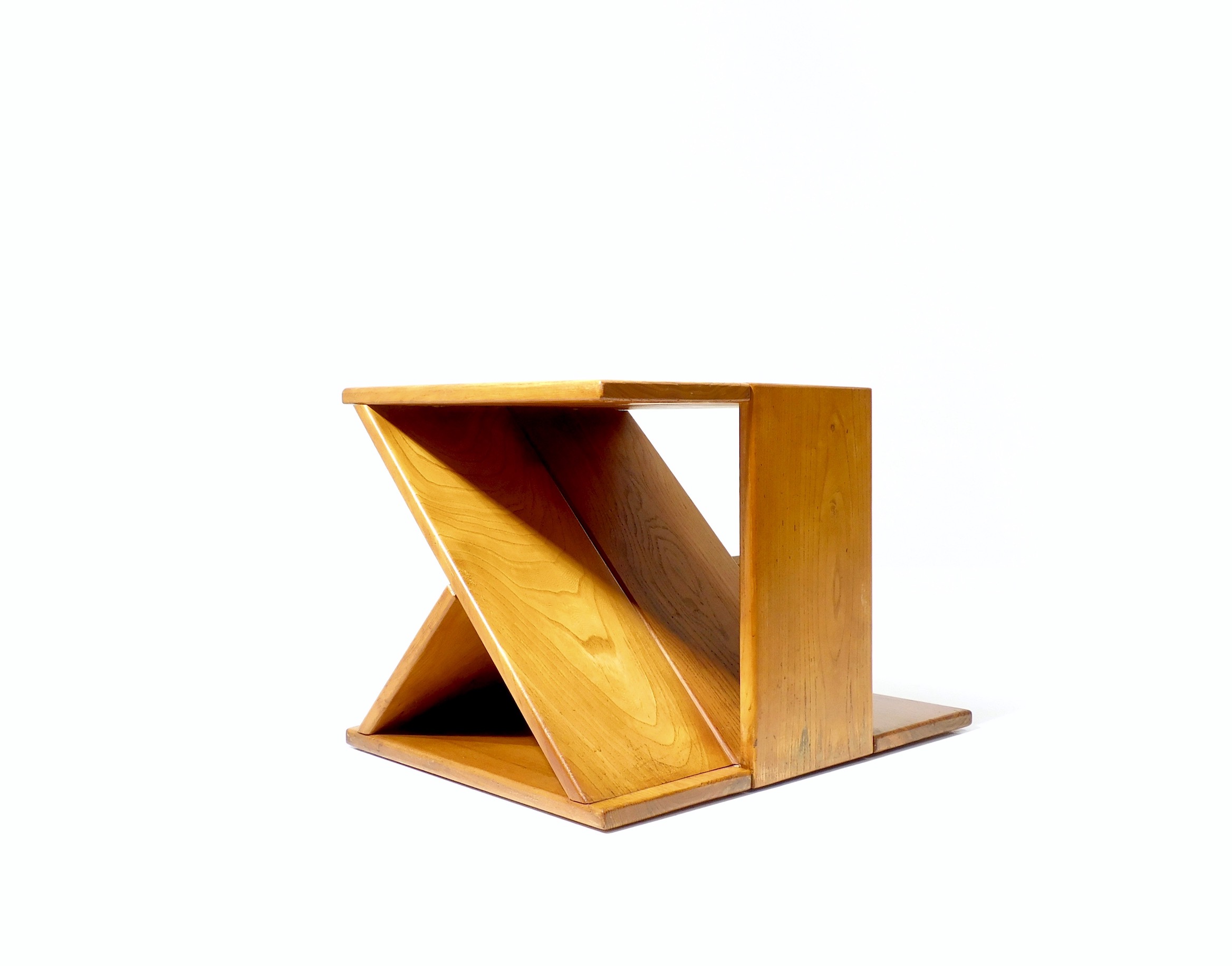 Der Französische Designer Alain Ladroit entwarf in den 1970/ 80er Jahren dieses fantastische, skulpturale Objekt, welches gleichzeitig Beistelltisch, Hocker und Zeitschriftensammler ist. Hergestellt wurde es durch das Französische Möbelunternehmen Maison Regain. Massives Ulmenholz, lackiert. Guter, stabiler Zustand mit charmanten Gebrauchspuren. Höhe 35cm.