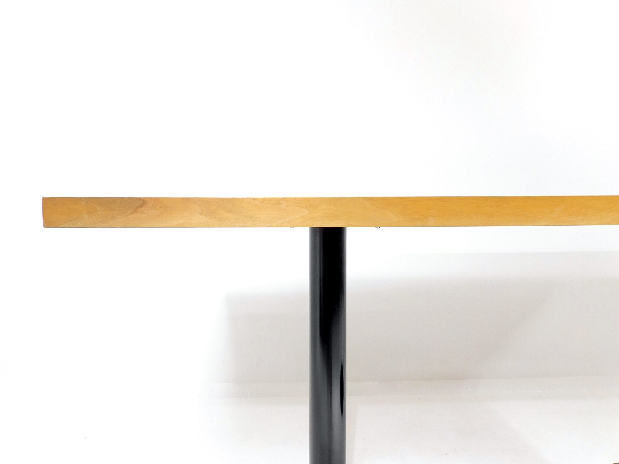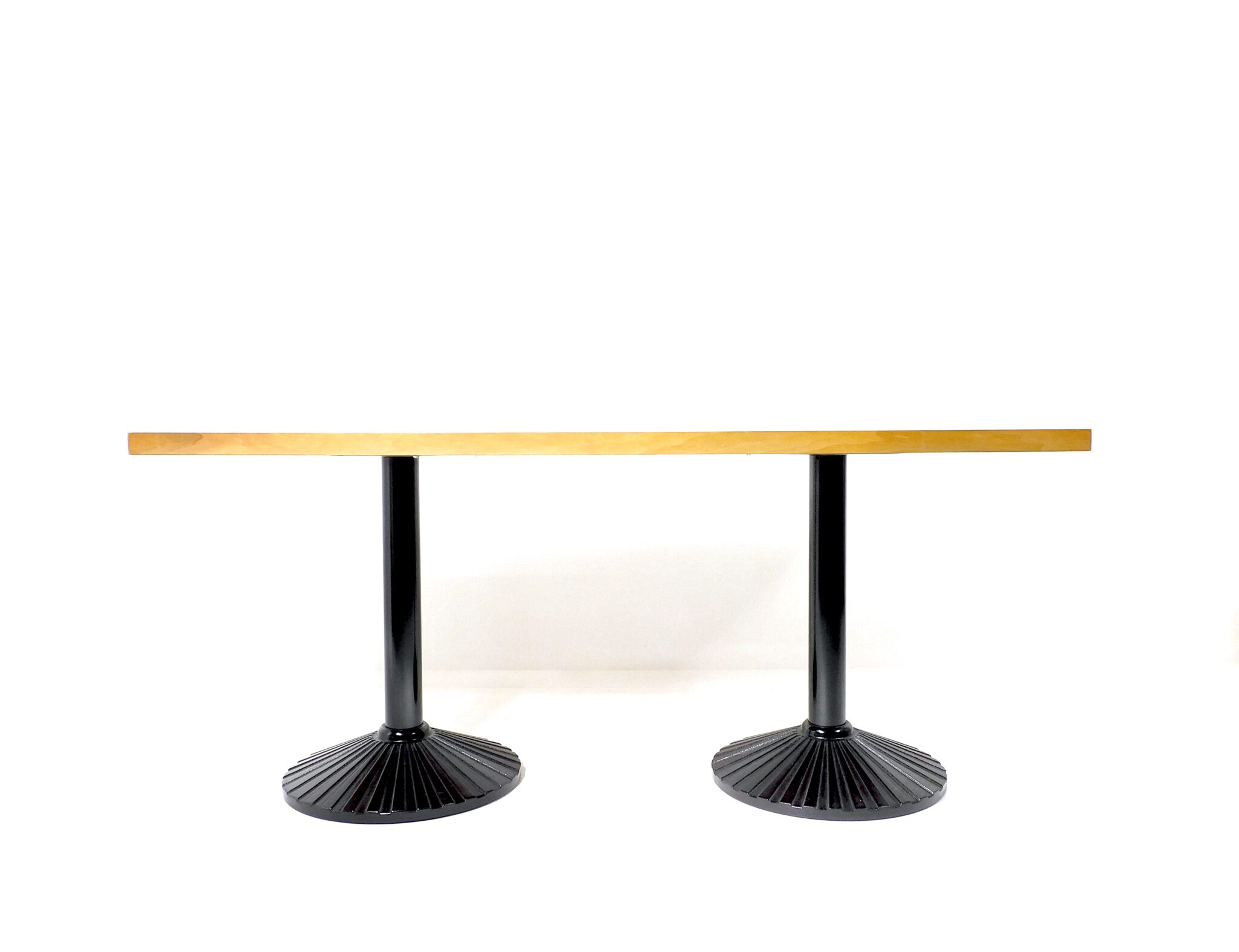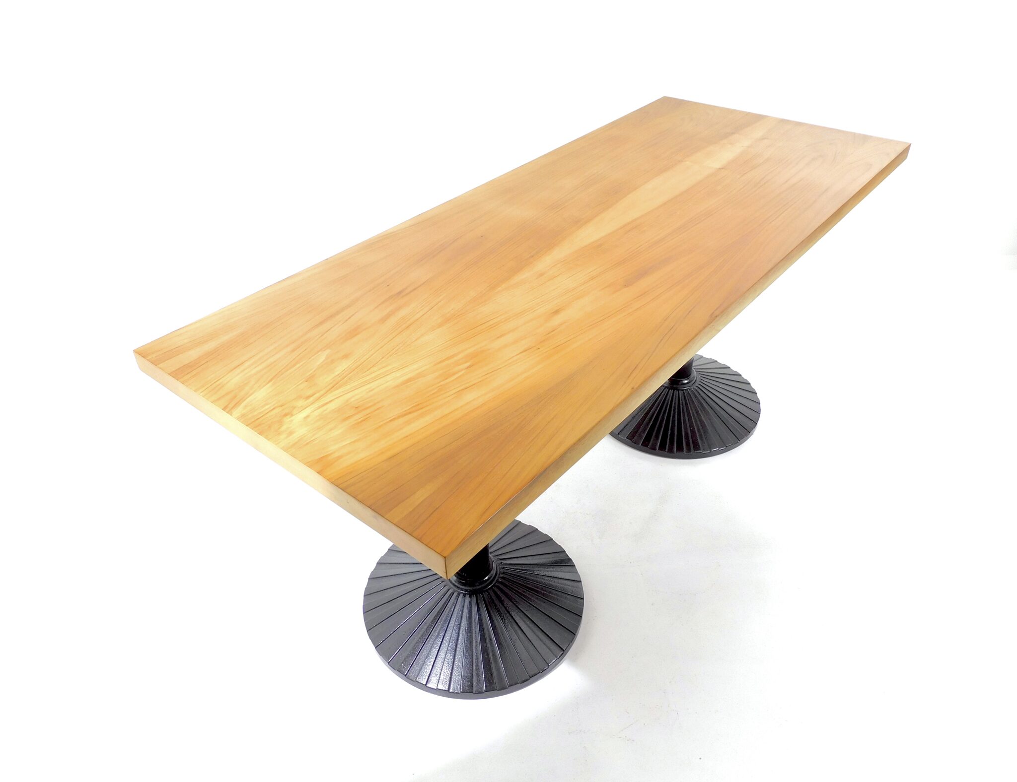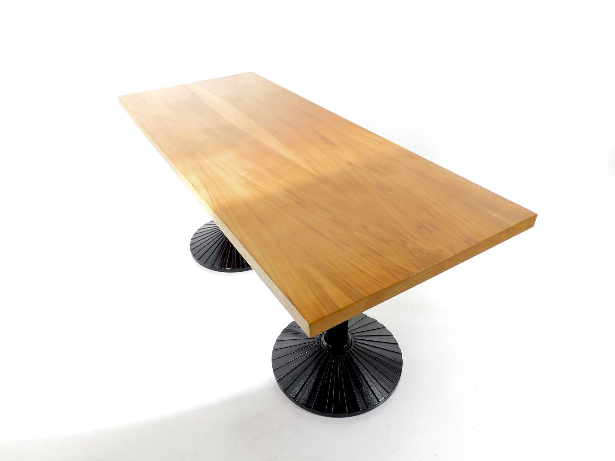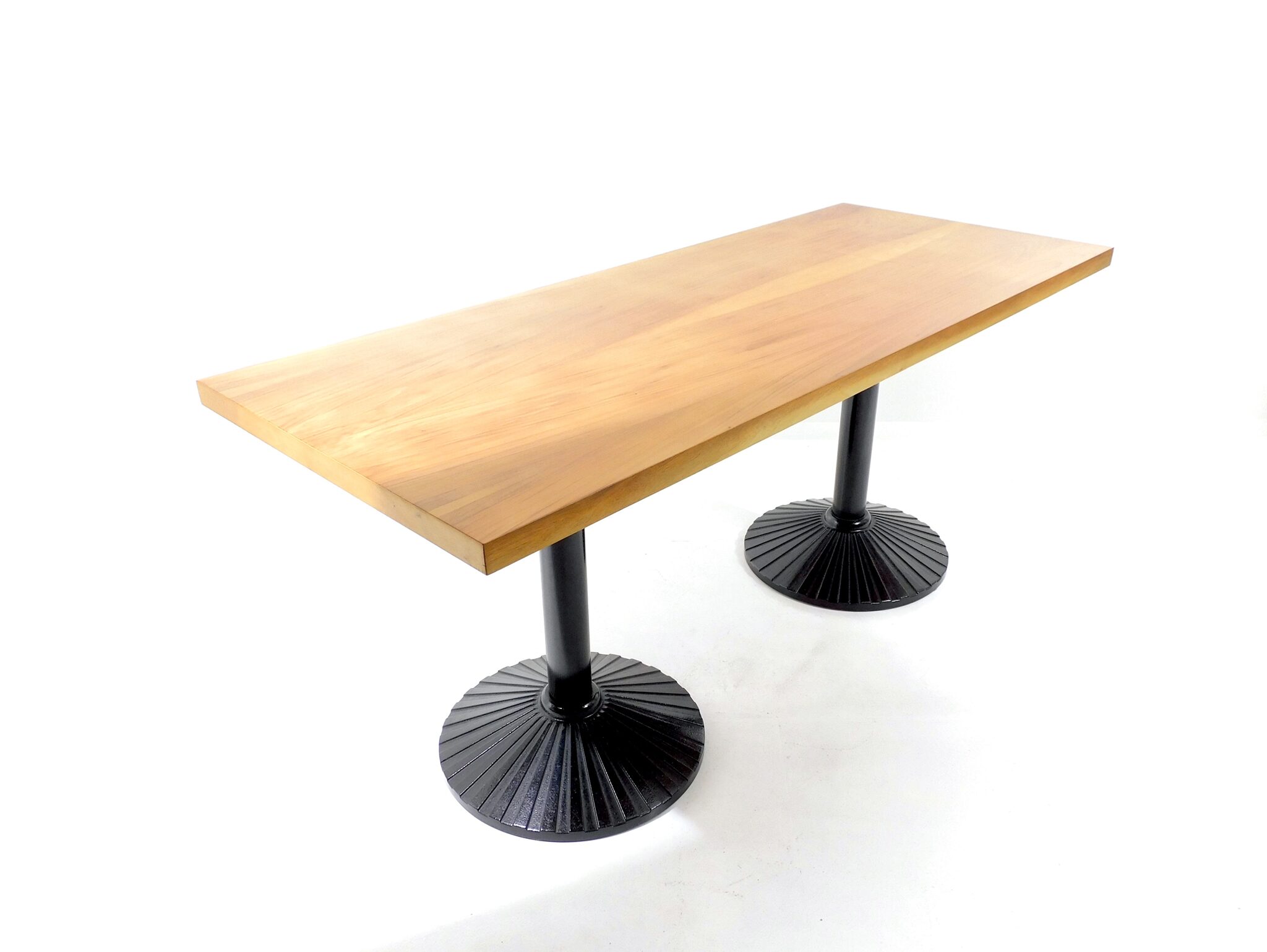 Der 170cm lange, robuste Tisch aus den 1980er Jahren eignet sich sowohl als Ess- wie auch als Arbeitstisch. Platte mit schönem Nussbaumfurnier, Füsse aus schwarz lackiertem Gusseisen. Marke Zanotta.