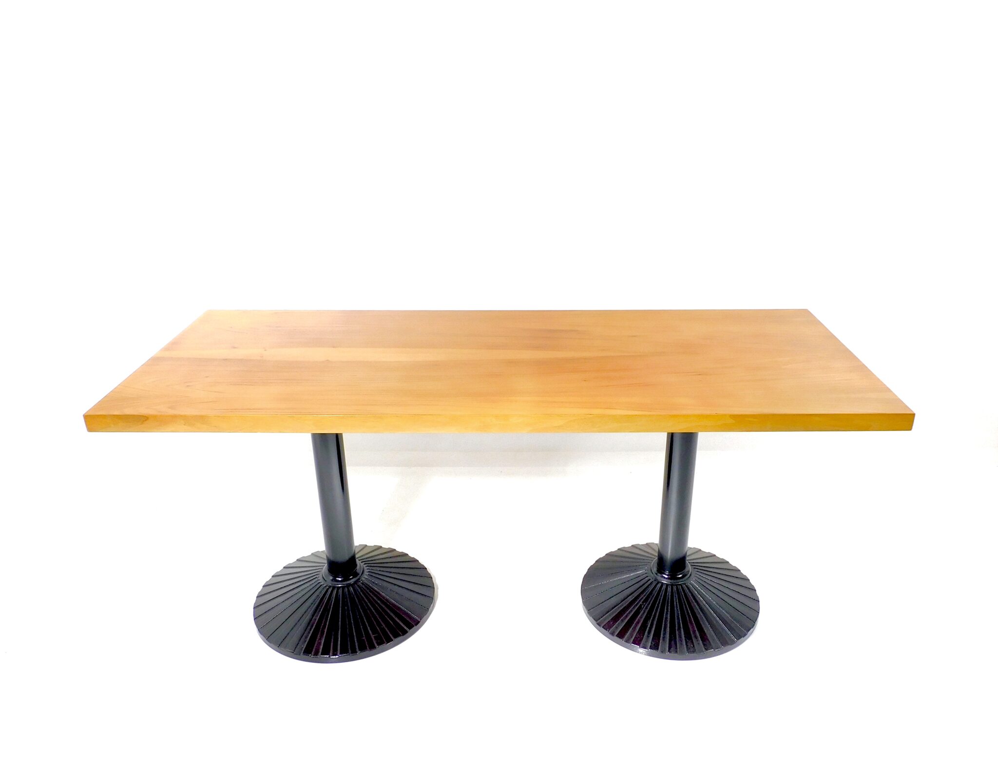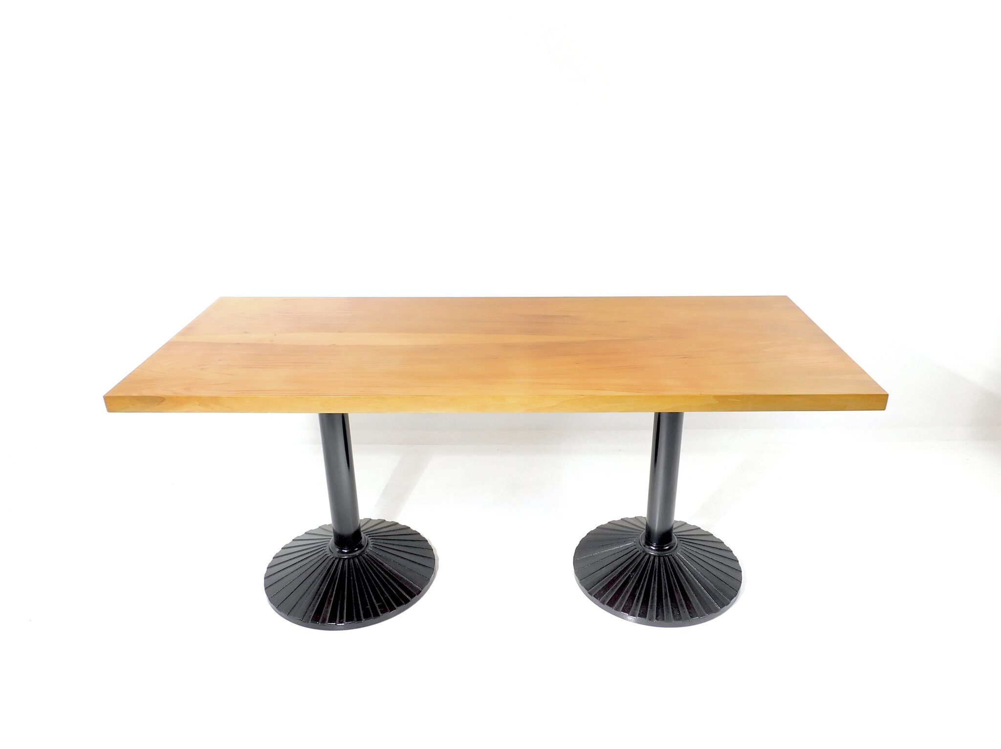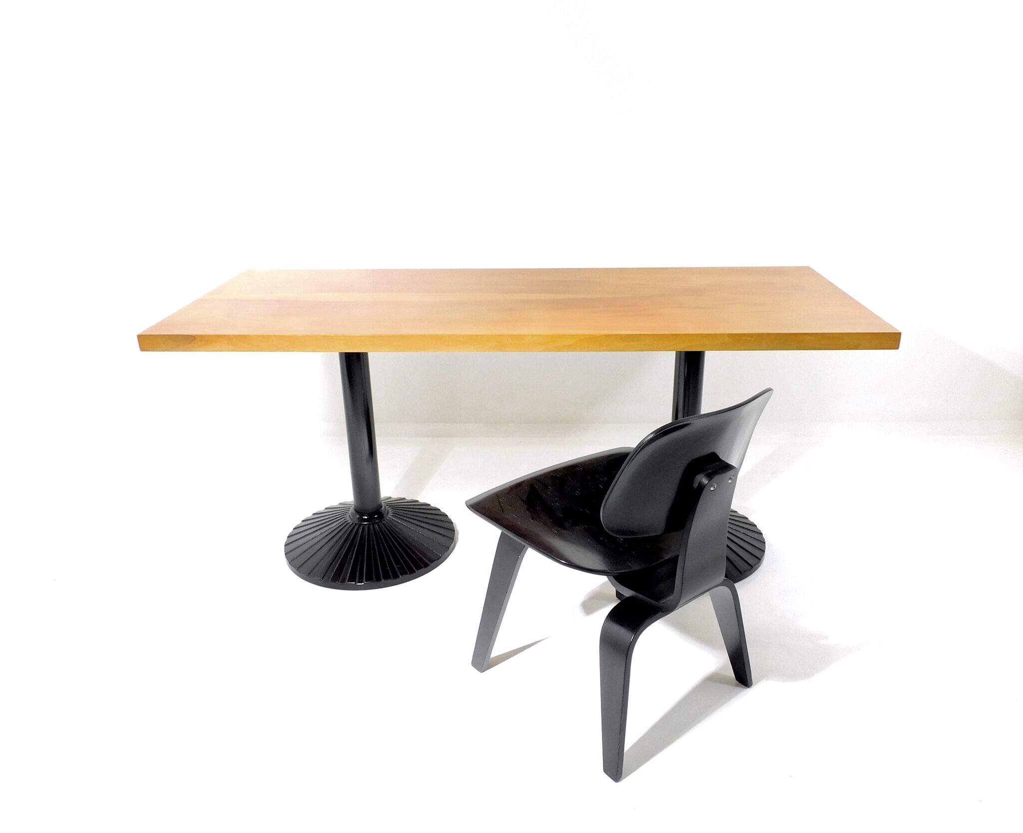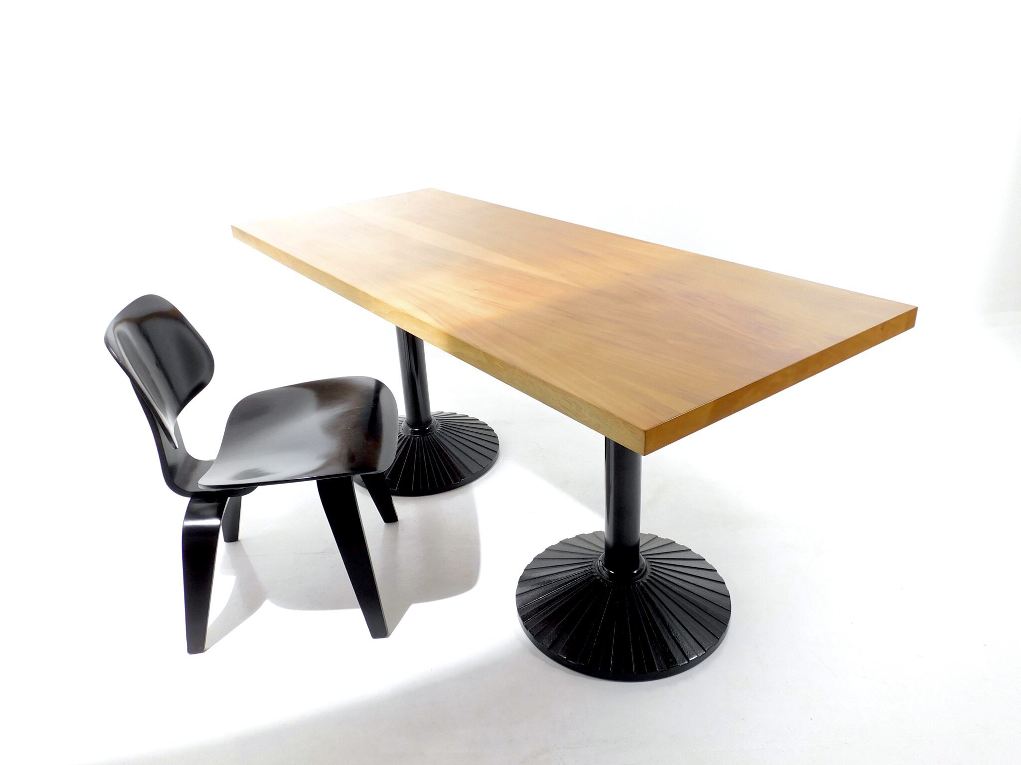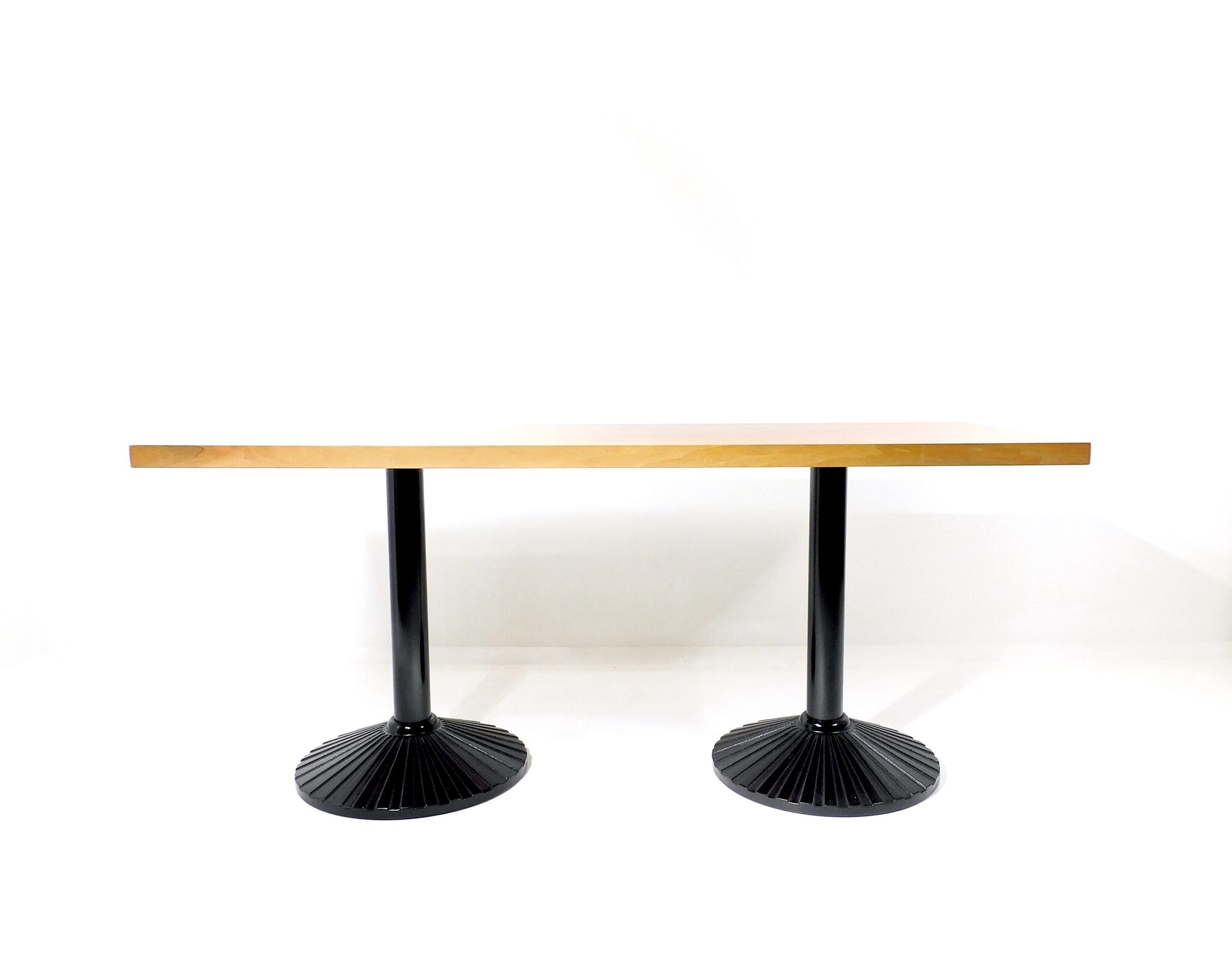 Der 170cm lange, robuste Tisch aus den 1980er Jahren eignet sich sowohl als Ess- wie auch als Arbeitstisch. Platte mit schönem Nussbaumfurnier, Füsse aus schwarz lackiertem Gusseisen. Marke Zanotta.