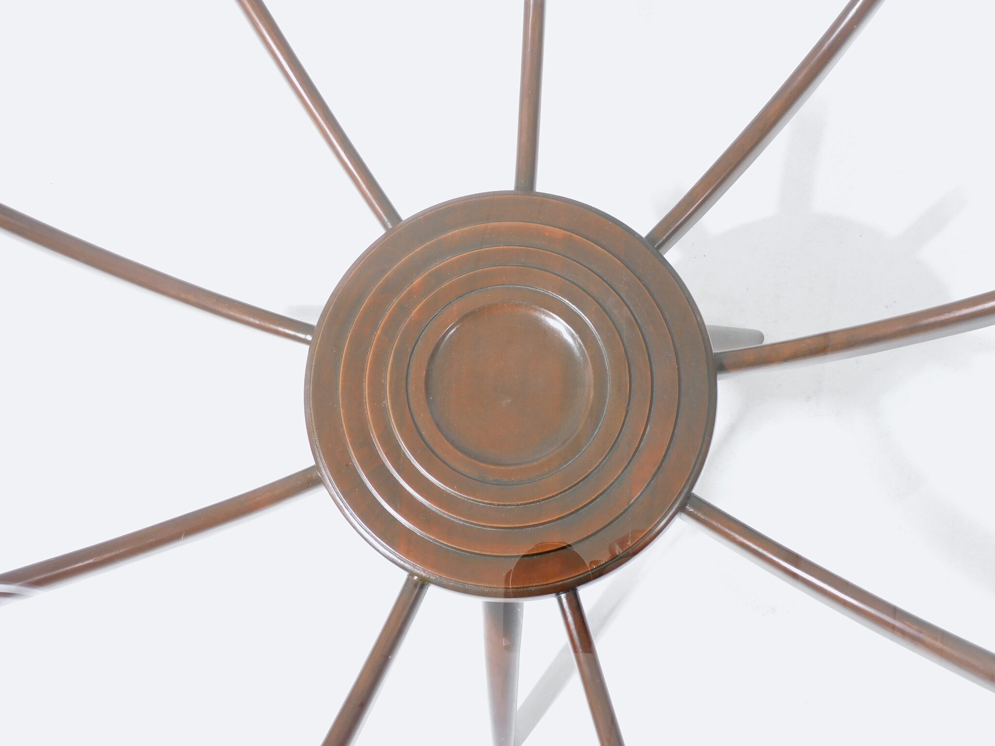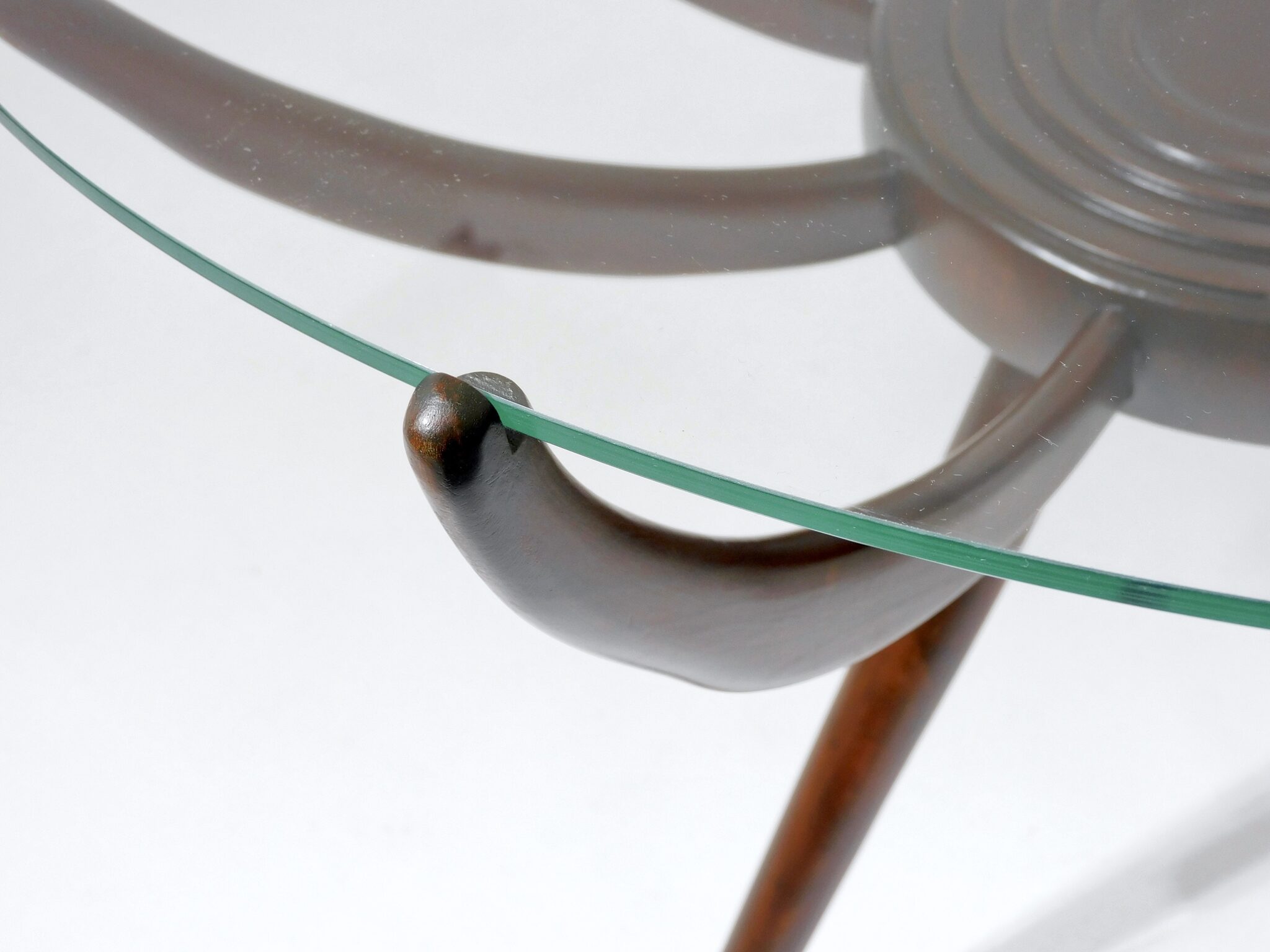 Der „Ragno“ Beistelltisch zählt zu bekanntesten Entwürfen des Italienischen Architekten und Designers Carlo de Carli (1910 – 1999). In den frühen 1930er Jahren studierte De Carli Architektur und Design am Mailänder Politecnico und arbeitete später eng mit Gio Ponti zusammen. Die Zusammenarbeit prägte Carlo de Carli’s Ansichten und Herangehensweise und er gründete anschliessend sein eigenes Studio in Mailand. Sein feines Gespür für moderne Werkstoffe sowie die Bereitschaft zum Experimentieren prägten Carlo De Carli’s Beitrag zur Architektur und zum Design der Nachkriegszeit. Seine Entwürfe wurden von namhaften Hersteller, wie beispielsweise Cassina, gefertigt. Der „Ragno“ Tisch (Ragno, Italienisch die Spinne) von 1950 wurde von verschiedenen Herstellern produziert. Eine genaue Zuordnung ist daher unsicher. Der Restaurator Roland Wyttenbach hat den Tisch aus massivem Buchenholz aufwändig aufgearbeitet. So wurden die Verbindungen neu verleimt, der alte Lack vollständig abgetragen, alles wieder neu gebeizt und lackiert. Der seltene Beistelltisch befindet sich daher in einem ausgezeichneten Zustand. Die Glasplatte wurde komplett neu angefertigt und zeigt keinerlei Gebrauchspuren. Durchmesser 72cm. Standort Kanzleistrasse.