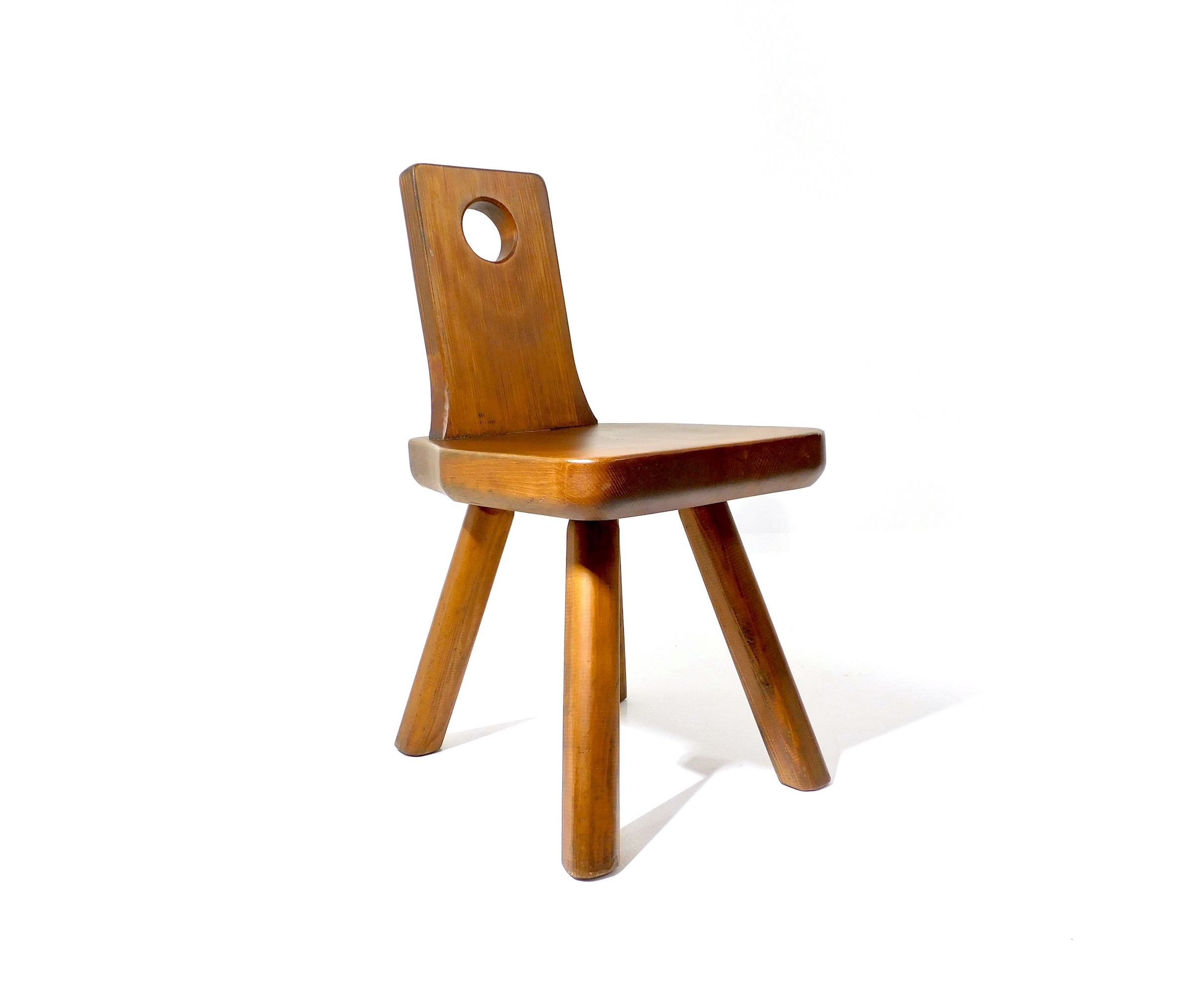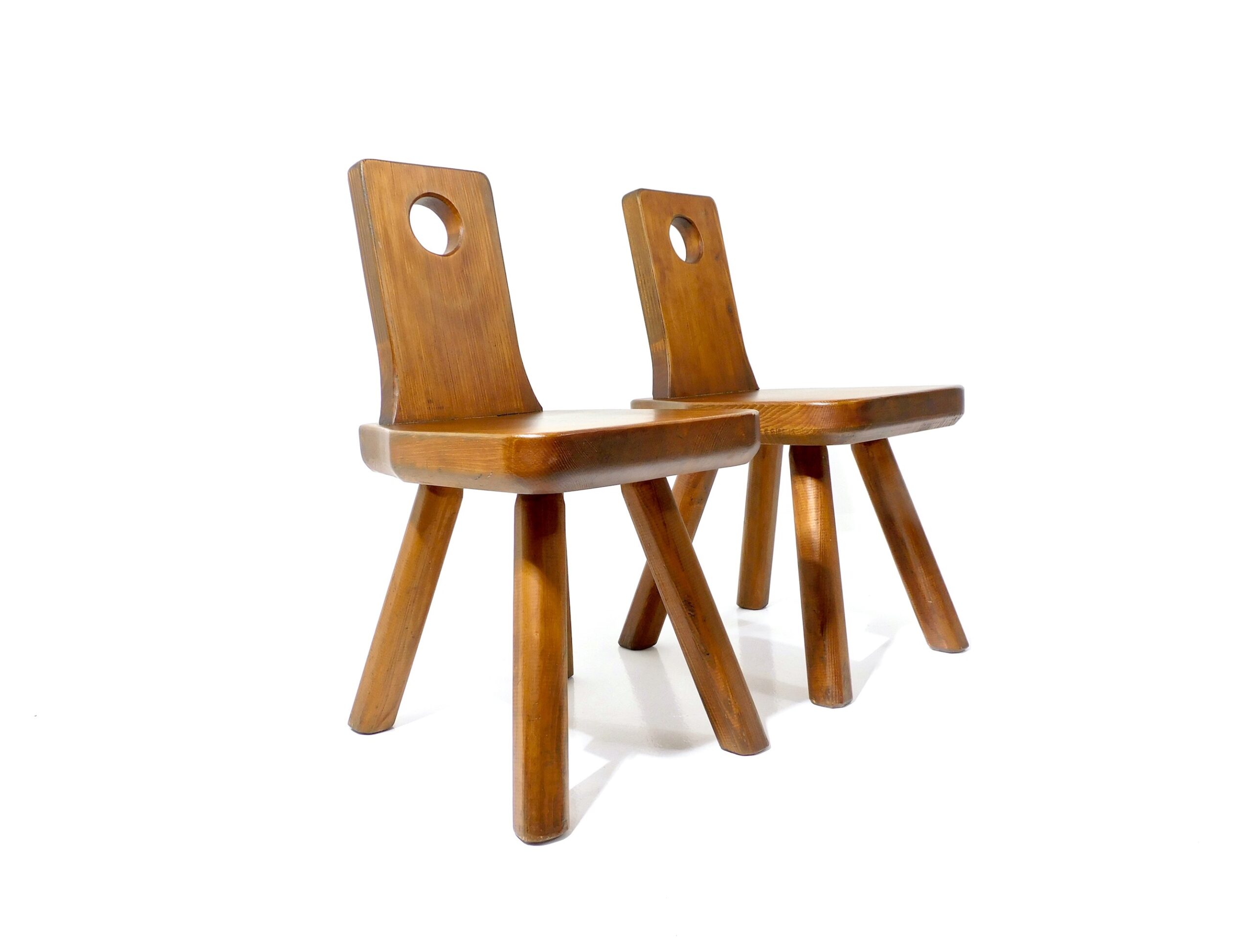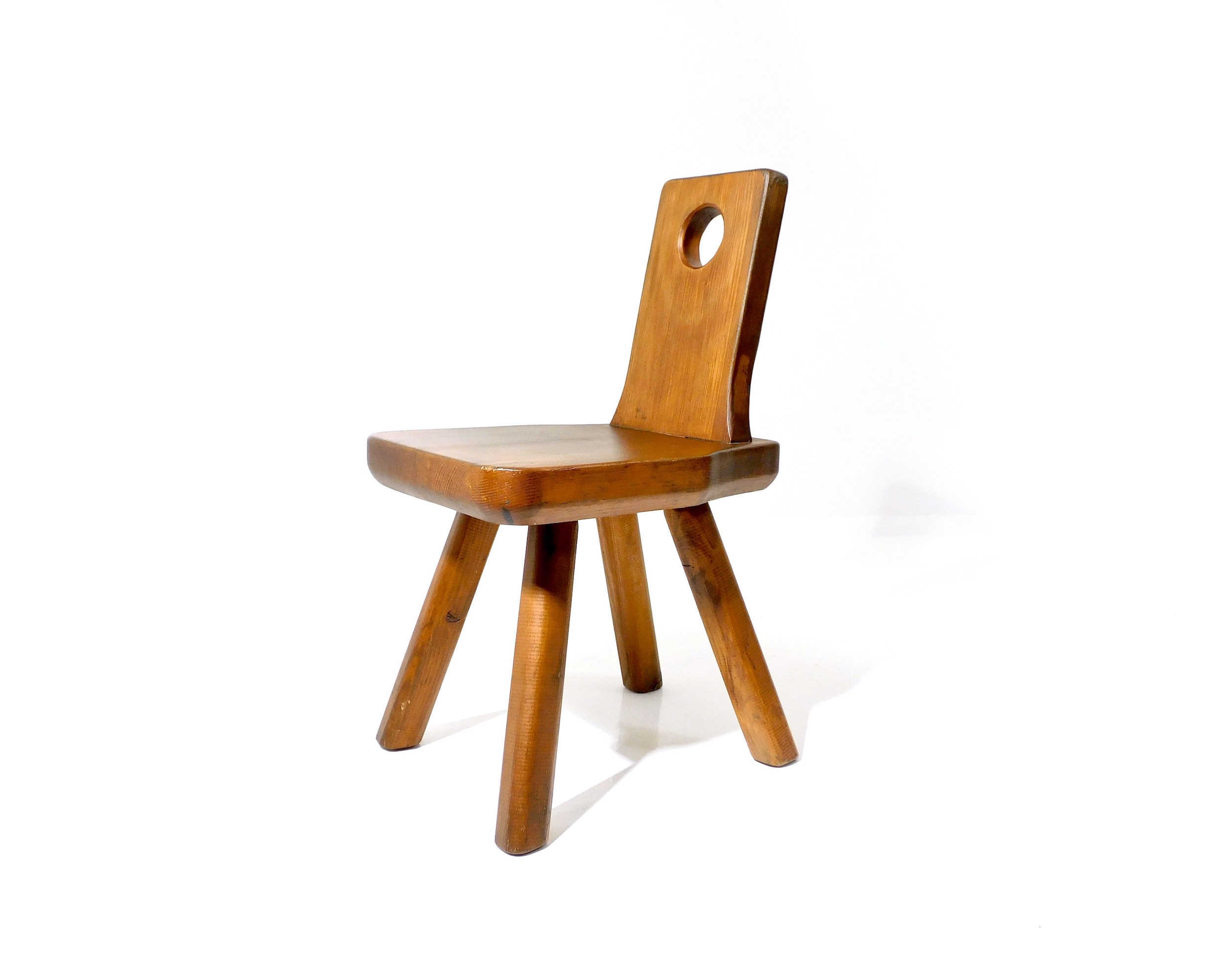 Brutalismus ist eine Stilrichtung in der Architektur und im Möbeldesign, welche in den 1950/ 60er Jahren verbreitet war. Merkmal war die monumentale, blockhafte und skulpturale Bauweise, sowie die klaren und massiven Formen ohne filigrane Verzierungen. Im Möbeldesign verwendete man v.a. Hölzer mit groben Maserungen und lies diese gerne unveredelt oder bewusst „unfertig“ wirken. Unsere beiden Stühle stammen vermutlich aus den 1970er Jahren. Unbekannte Herkunft. Gute, schwere Qualität. Das massive Fichtenholz wurde dunkel gebeizt und lackiert. Sehr guter Zustand, mit schöner Patina. Bei einem Stuhl hat der Restaurator Roland Wyttenbach eine Schadstelle repariert und die Rückenlehne von unten verstärkt. Sitzhöhe 44cm. Preis fürs Paar Fr. 950.-. Standort Aussenlager. Besichtigung jederzeit möglich.