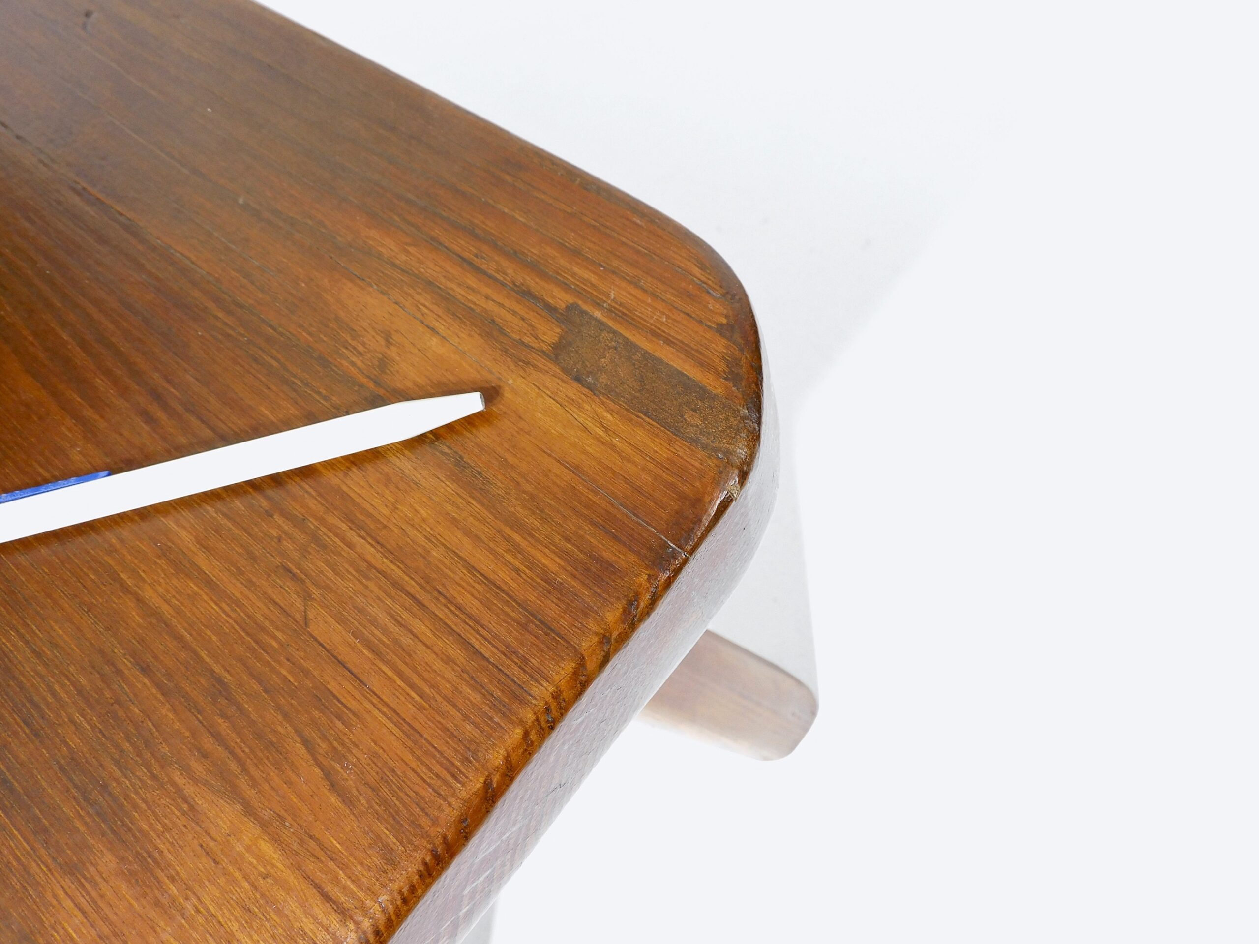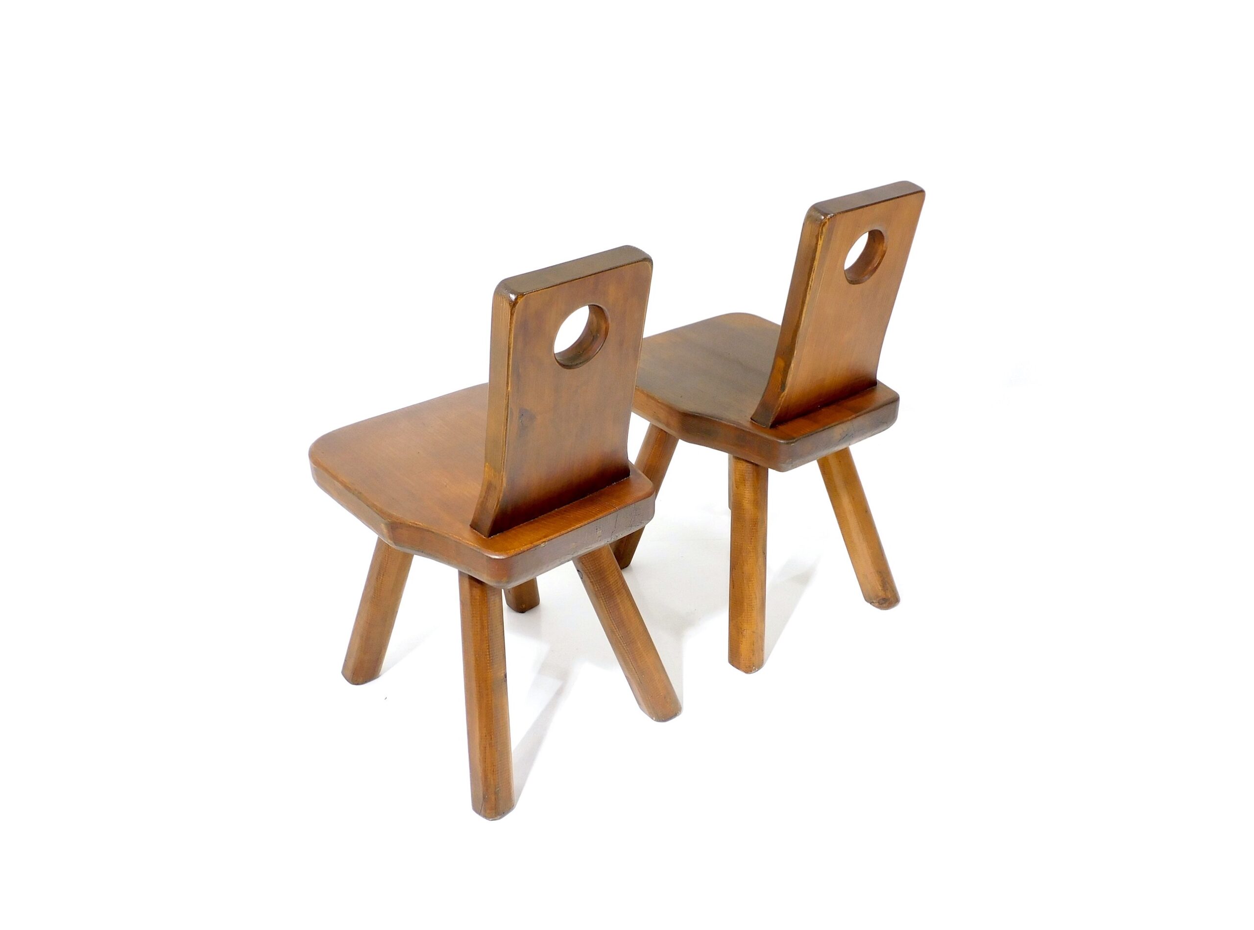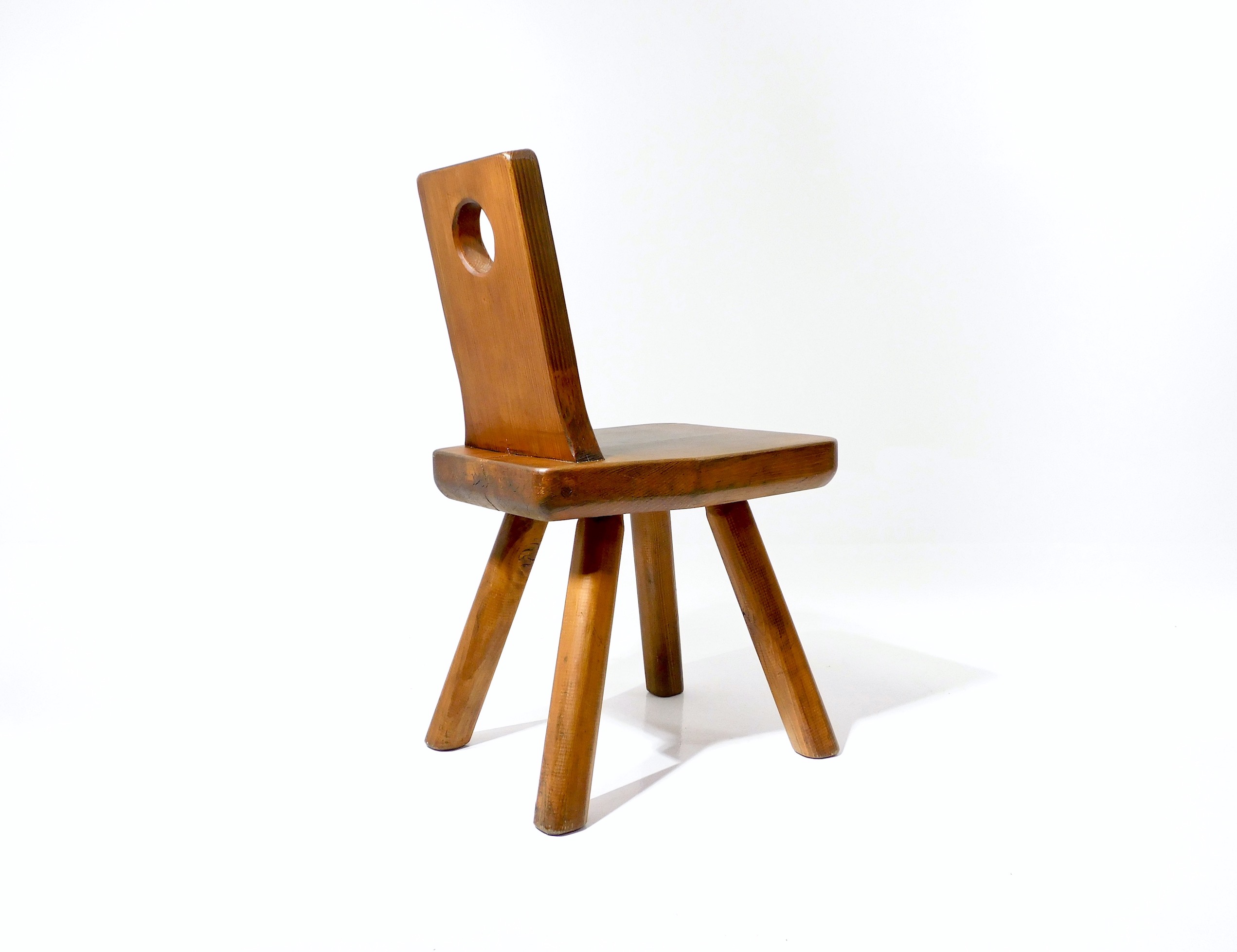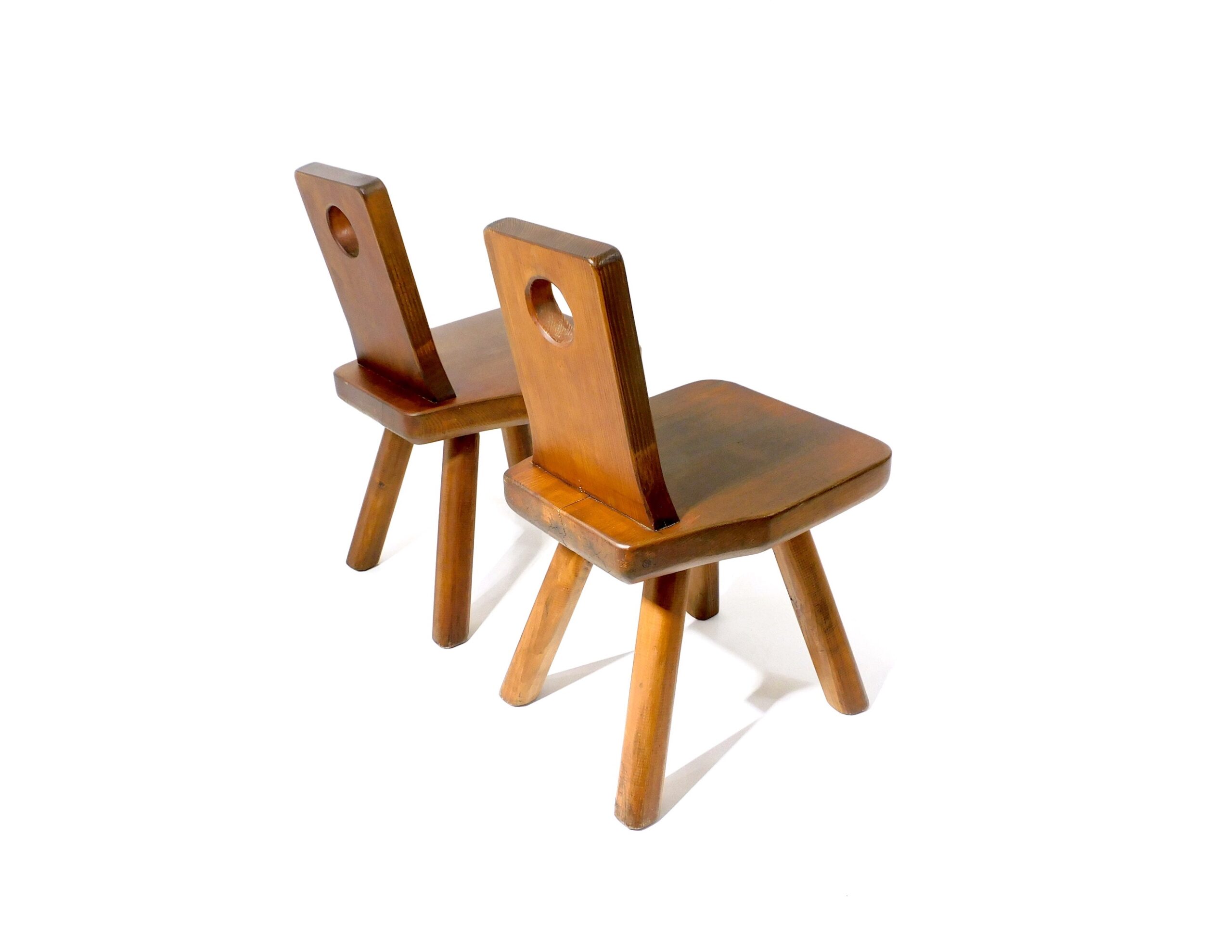 Brutalismus ist eine Stilrichtung in der Architektur und im Möbeldesign, welche in den 1950/ 60er Jahren verbreitet war. Merkmal war die monumentale, blockhafte und skulpturale Bauweise, sowie die klaren und massiven Formen ohne filigrane Verzierungen. Im Möbeldesign verwendete man v.a. Hölzer mit groben Maserungen und lies diese gerne unveredelt oder bewusst „unfertig“ wirken. Unsere beiden Stühle stammen vermutlich aus den 1970er Jahren. Unbekannte Herkunft. Gute, schwere Qualität. Das massive Fichtenholz wurde dunkel gebeizt und lackiert. Sehr guter Zustand, mit schöner Patina. Bei einem Stuhl hat der Restaurator Roland Wyttenbach eine Schadstelle repariert und die Rückenlehne von unten verstärkt. Sitzhöhe 44cm. Preis fürs Paar Fr. 950.-. Standort Aussenlager. Besichtigung jederzeit möglich.